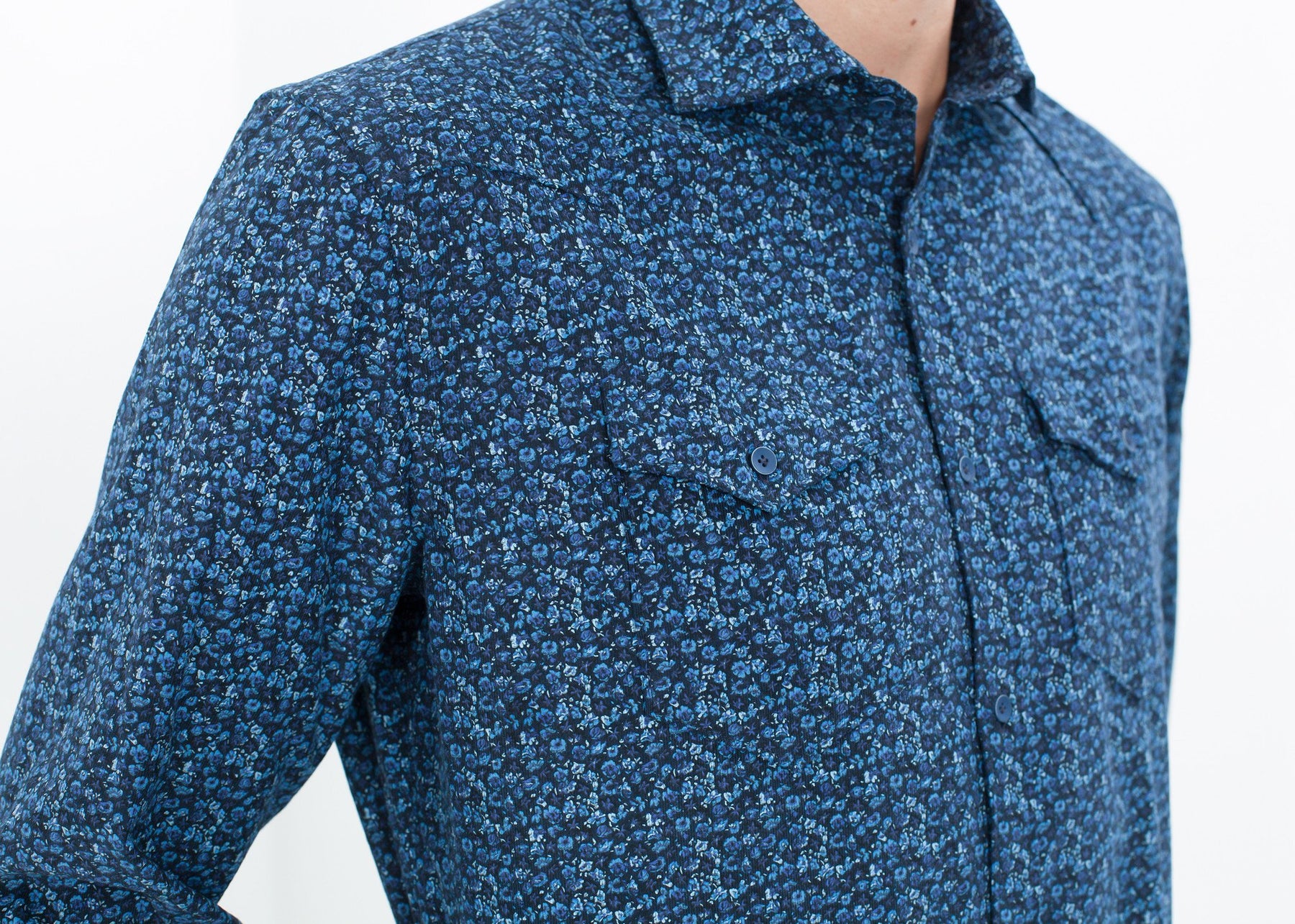 A Western style shirt gets a sweet touch with an all over floral motif. Two flap pockets at the chest and a classic western style yoke finishes the back. Aglini. Color Blue Floral. 100% Cotton. Made in Italy. Matt is wearing an Italian 42. Matt is 6’2”, Chest 38”, Waist 31”, Inseam 34.5”.